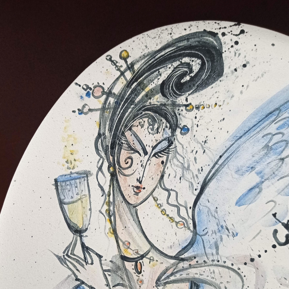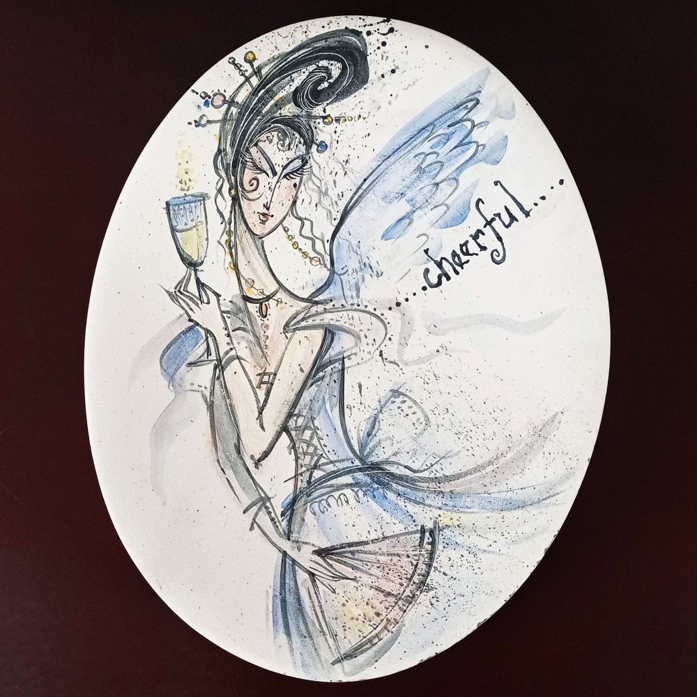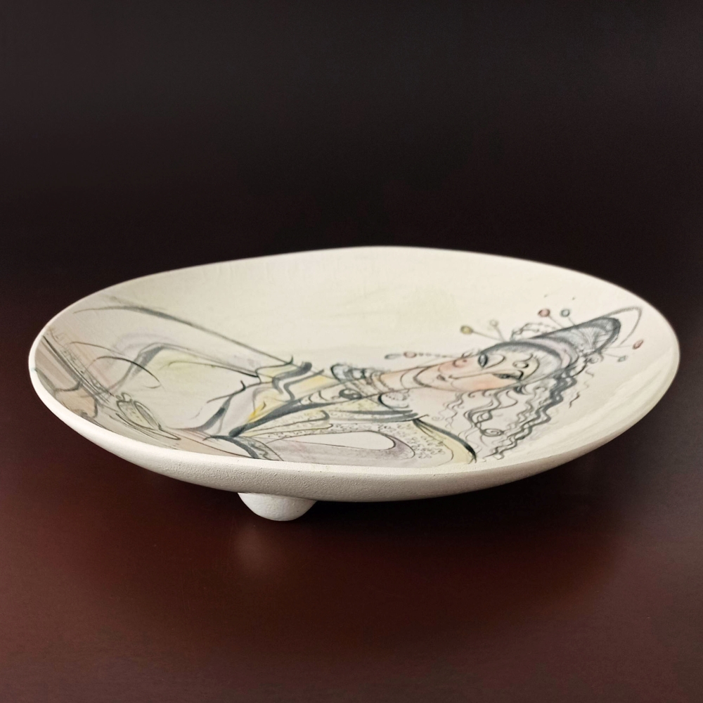 Keramická dekorační malovaná mísa - Anděl s vínem. Po prvním výpalu (přežahu) je na míse provedena ruční malba barevnými glazurami (štětcová malba). Celá mísa je ještě glazovaná transparentní průhlednou glazurou a vypálena na 1050 C° (druhý výpal). Mísa není určena jako jídelní, může sloužit k různým stolním aranžím (ovoce, přírodniny, šperky, koupelnová kosmetika atd.). Mísu můžeme také zavěsit na stěnu (závěs dodáme na přání zákazníka). Glazury jsou zdravotně nezávadné (nákup od certifikovaných výrobců). Autor malby: Helena Augustýnová. Mísa je signovaná. Cena na vyžádání a předání dle dohody (tel.: 606 429 651).