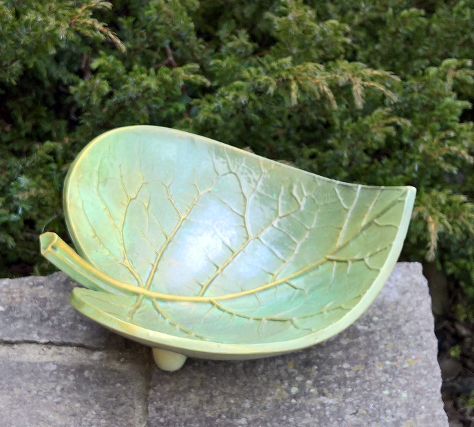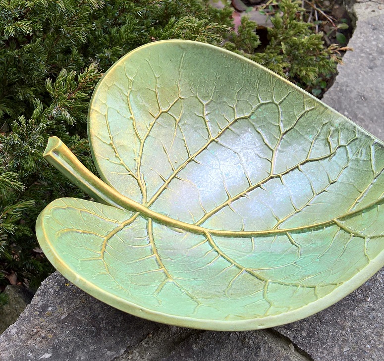 Keramická mísa listového tvaru. Glazura - zeleno zlatá. Mísa je vypálená na 1050 C°. Mísa je určená jako interiérový luxusní dekorační objekt k různým aranžím ovoce, přírodnin. Mísu můžeme také použít na odkládání šperků, koupelnové kosmetiky atd. Mísa není určená jako jídelní, slouží jako estetický prvek v interiéru. Glazury jsou zdravotně nezávadné (nákup od certifikovaných výrobců). Autor mísy: Akad. mal. Jaroslav Chadima. Mísa je signovaná, autorský podpis (vypálený) najdete na spodní části mísy. Cena na vyžádání a předání dle dohody. Tel.: 606 429 6
