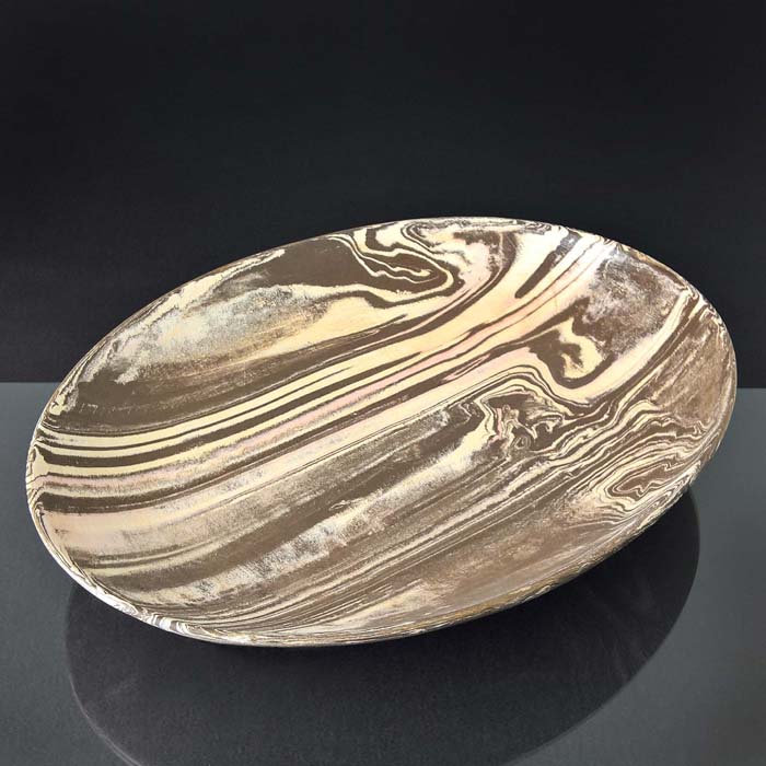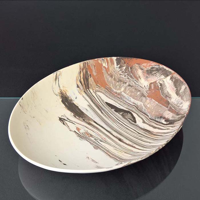 Keramické achátové mísy - varianty. Každá mísa je ručně vyrobená z různě barevných hlín, které jsou pod tlakem spojené a vytvářejí zajímavý „achátový“ vzor (výrobně náročný postup). Mísa je glazovaná jen transparentní průhlednou glazurou. Váza je vypálená na 1050 C°. Mísa je určená jako interiérový luxusní dekorační objekt k různým aranžím ovoce, přírodnin. Mísu můžeme také použít na odkládání šperků, koupelnové kosmetiky atd. Mísa není určená jako jídelní, slouží jako estetický prvek v interiéru. Glazury jsou zdravotně nezávadné (nákup od certifikovaných výrobců). Autor mísy: Akad. mal. Jaroslav Chadima. Mísa je signovaná, autorský podpis (vypálený) najdete na spodní části mísy. Cena na vyžádání a předání dle dohody. Tel.: 606 429 651