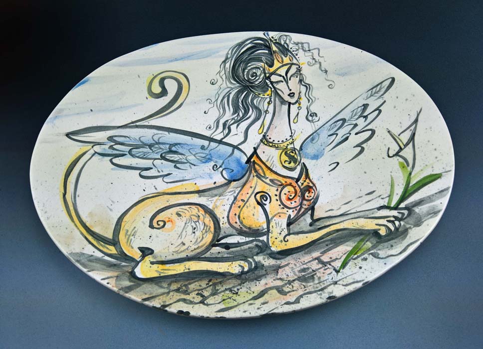 Keramický malovaný talíř s antickým motivem. Po prvním výpalu je na talíři provedena ruční malba barevnými glazurami (štětcová malba). Celý talíř je ještě glazovaný transparentní průhlednou glazurou a vypálen na 1050 C° (druhý výpal). Talíř může sloužit k různým stolním aranžím (ovoce, přírodniny, šperky, koupelnová kosmetika atd.). Talíř se může také zavěsit na stěnu jako dekorační předmět (závěs dodáme na přání zákazníka). Talíř není určený pro venkovní použití. Autor: Helena Augustýnová. Talíř je signovaný. Cena na vyžádání a předání dle dohody (tel.: 606 429 651).